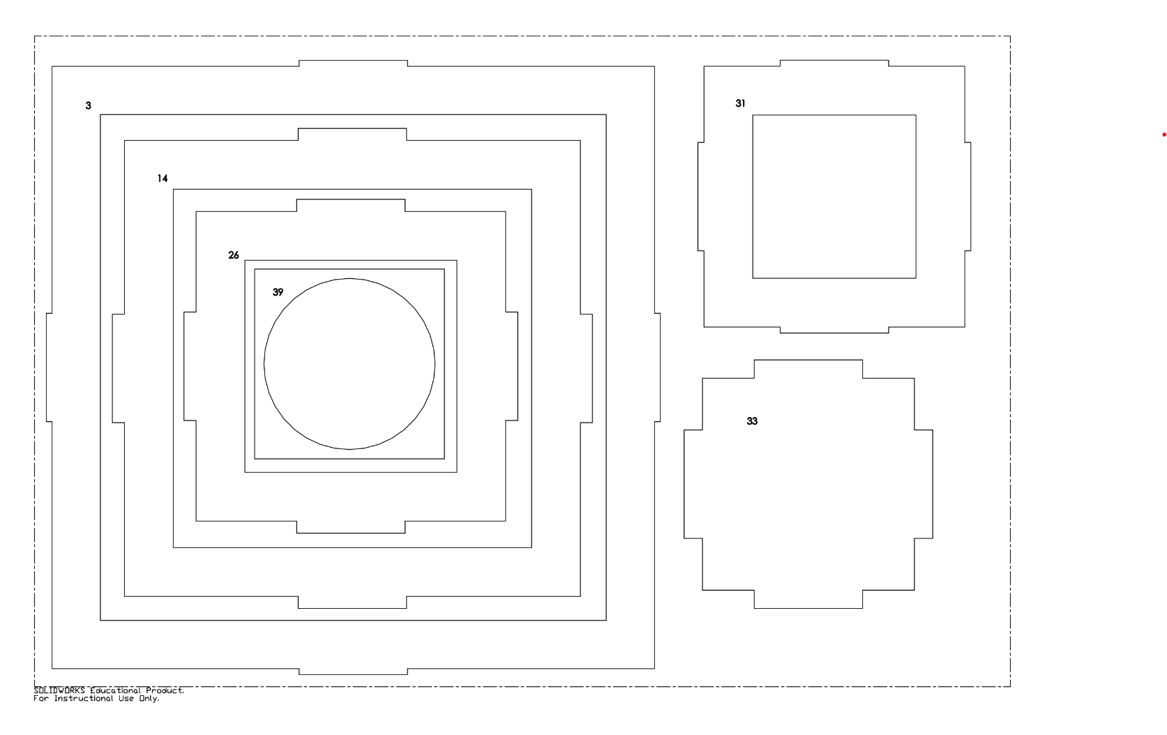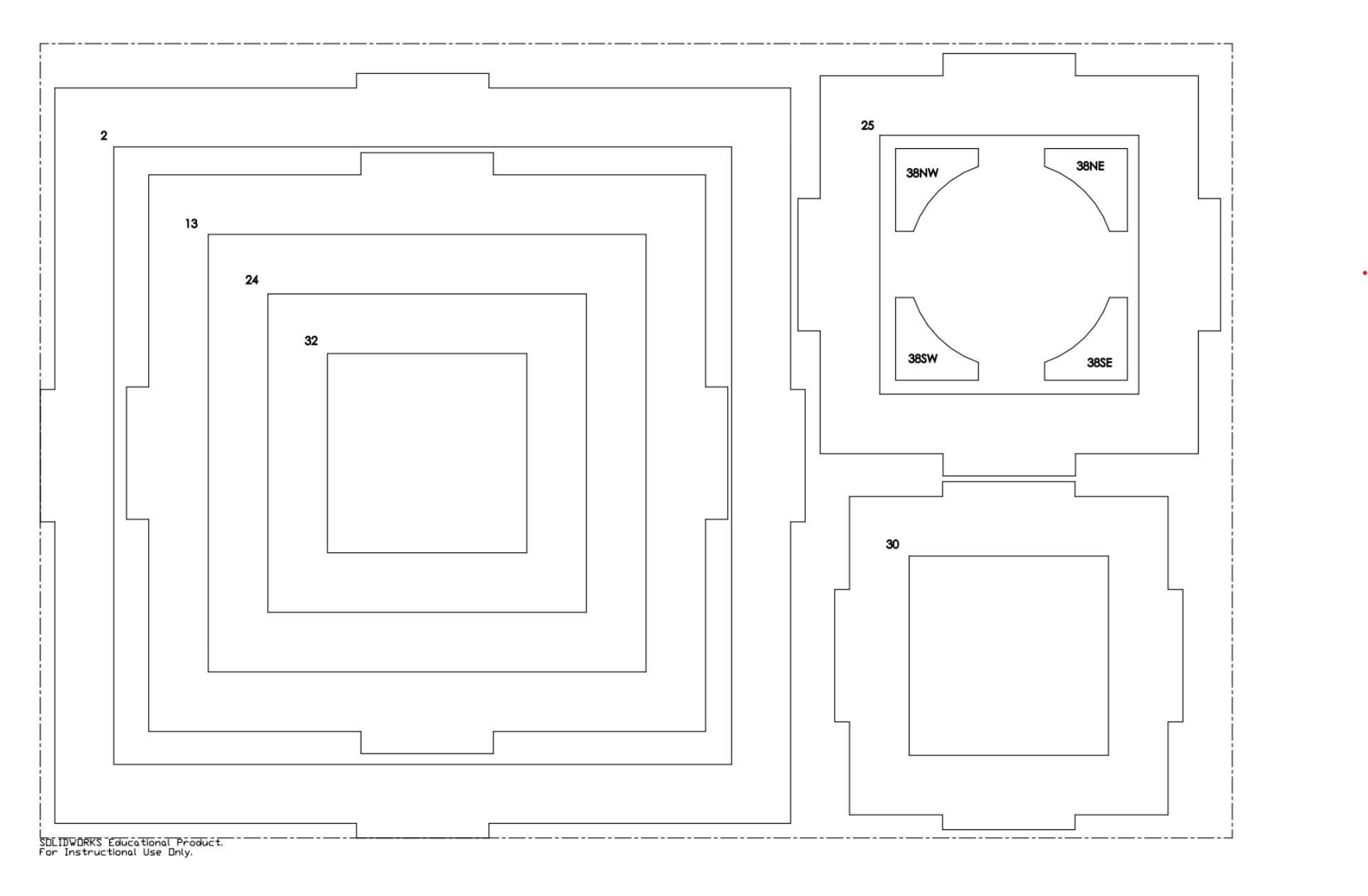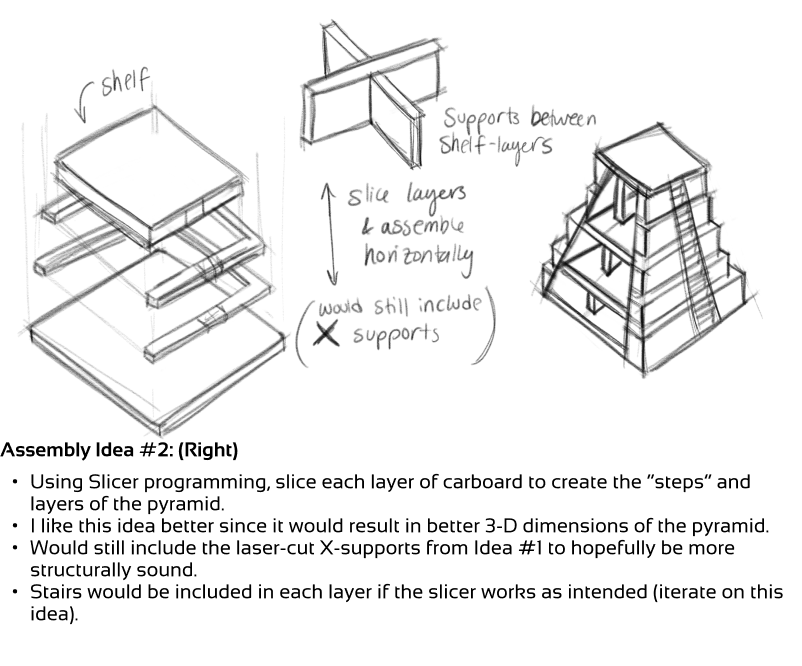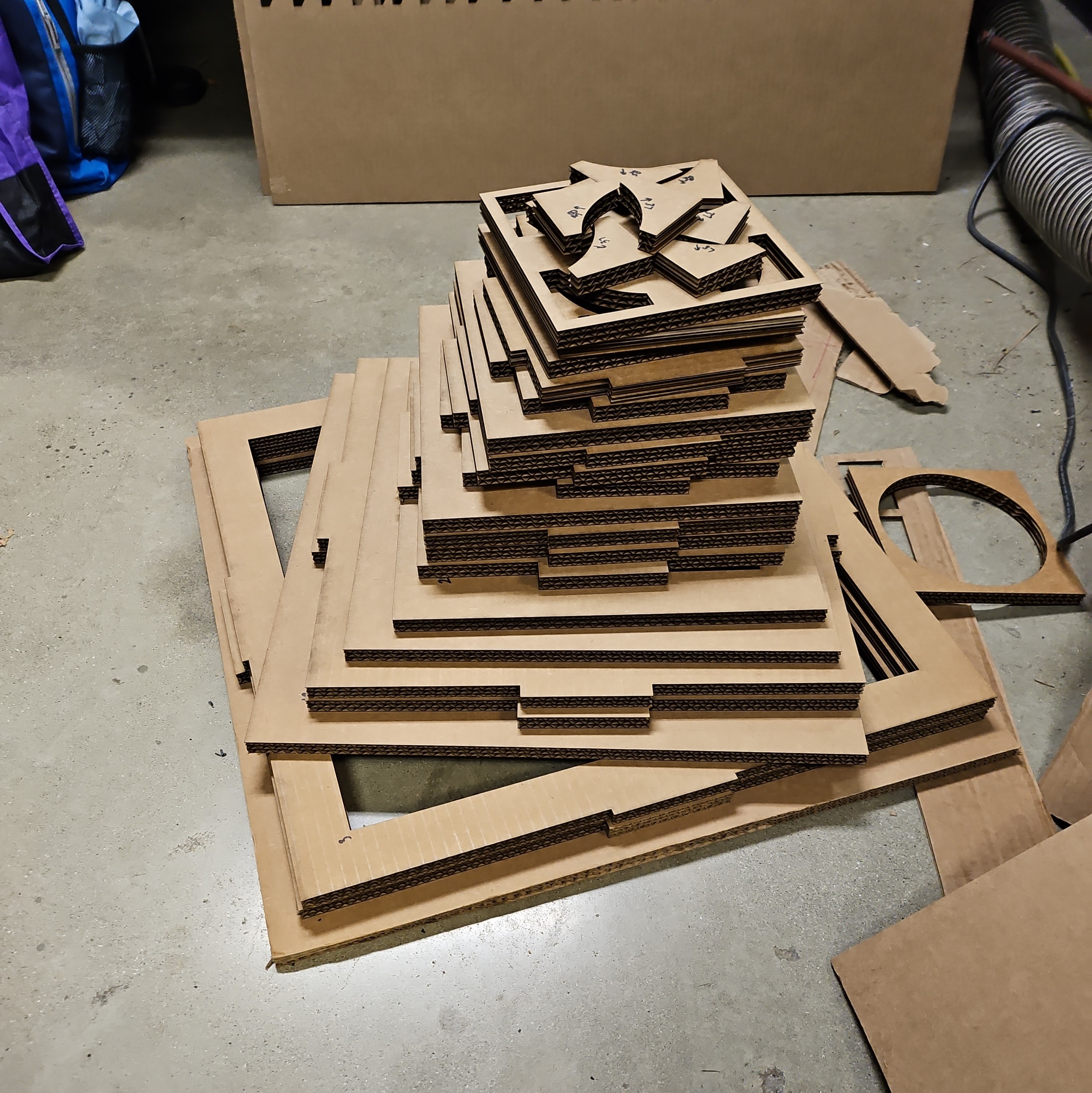 Using 1/2” triple corrugated cardboard, I manually sliced each layer of the pyramid and aimed to maximize laser bed spacing by placing as many layers as possible on the same laser bed. In the future, I would reshape the inner shell of my pyramid to account for the stairs extrusion, using less cardboard and making the manufacturing process more efficient. After starting a (small) fire and adjusting laser-intensity settings, the laser-cutting process went smoothly, and I glued all the layers together.