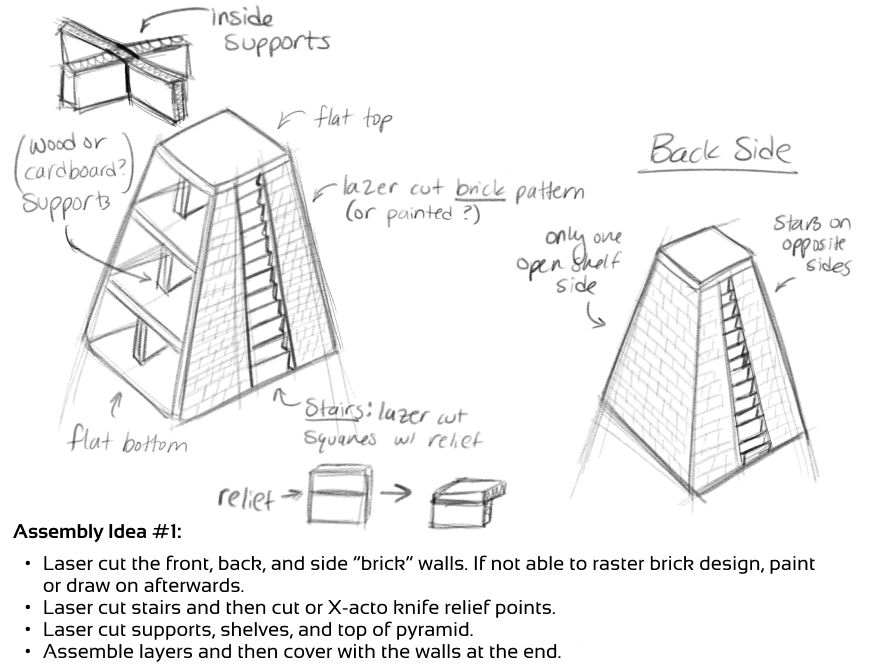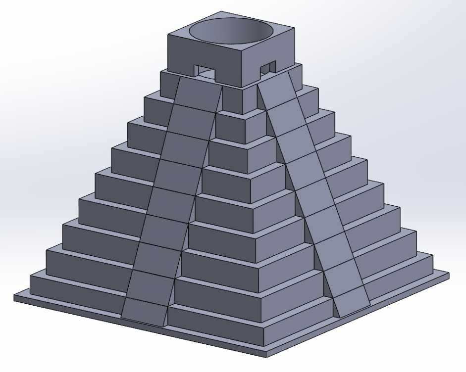 Initial brainstorming included a shelving component in the pyramid so the negative space inside could be used for storage. I didn't want to sacrifice the structure of the object, so to keep a focused vision on the product's function, I decided to remove the shelving space to maximize the pyramid's appearance. Instead, I did not glue the top and bottom halves of the pyramid together, allowing the negative space to serve as hidden storage. The product was scaled down to serve a 2x2x2 ft space, which compressed the Chichen Itza structure horizontally.