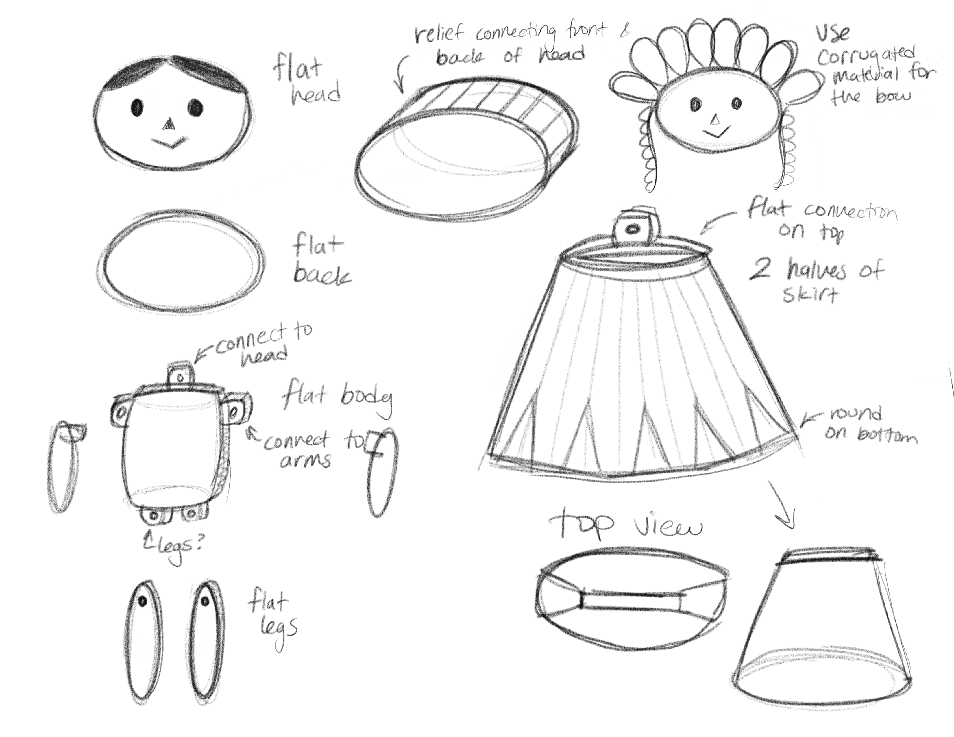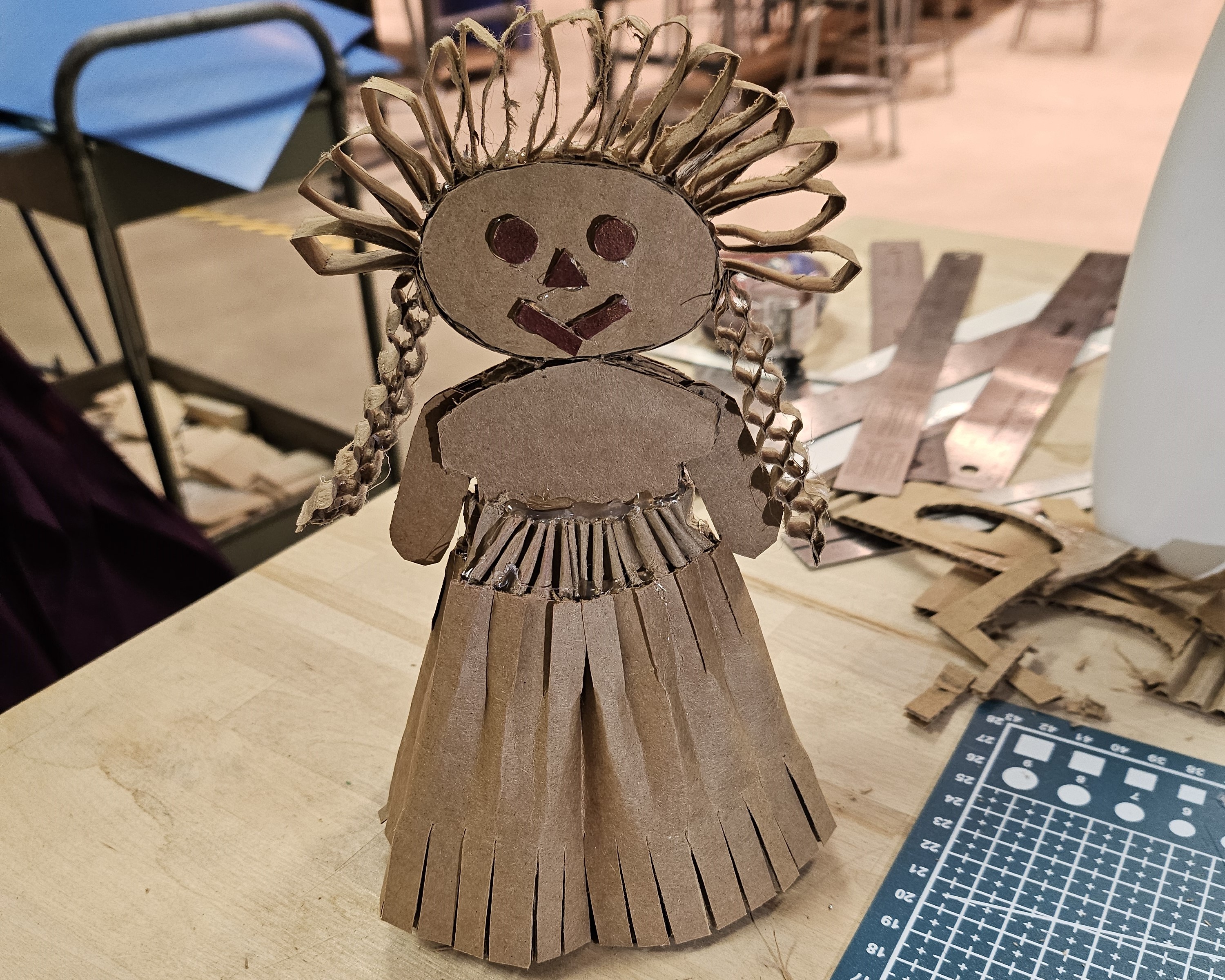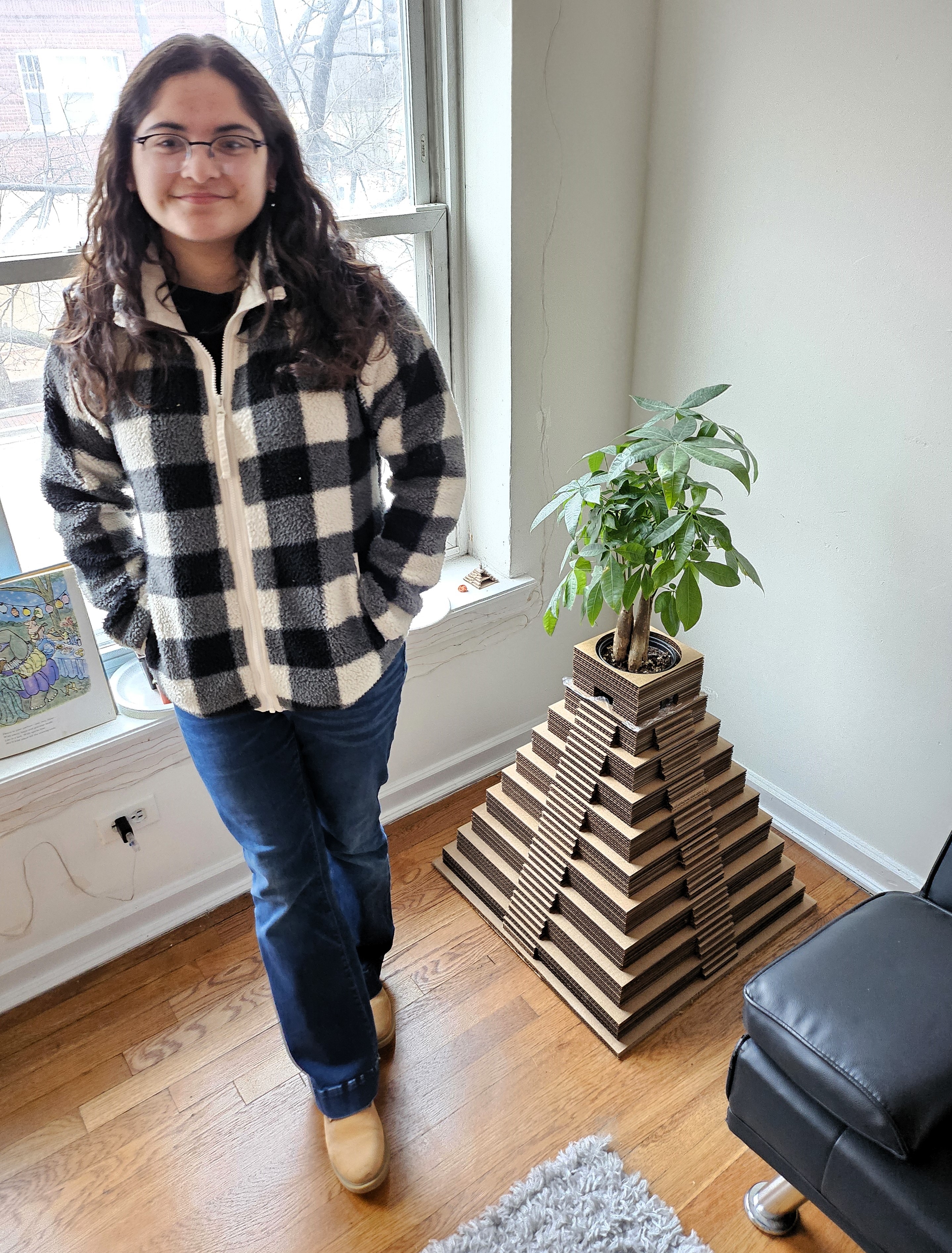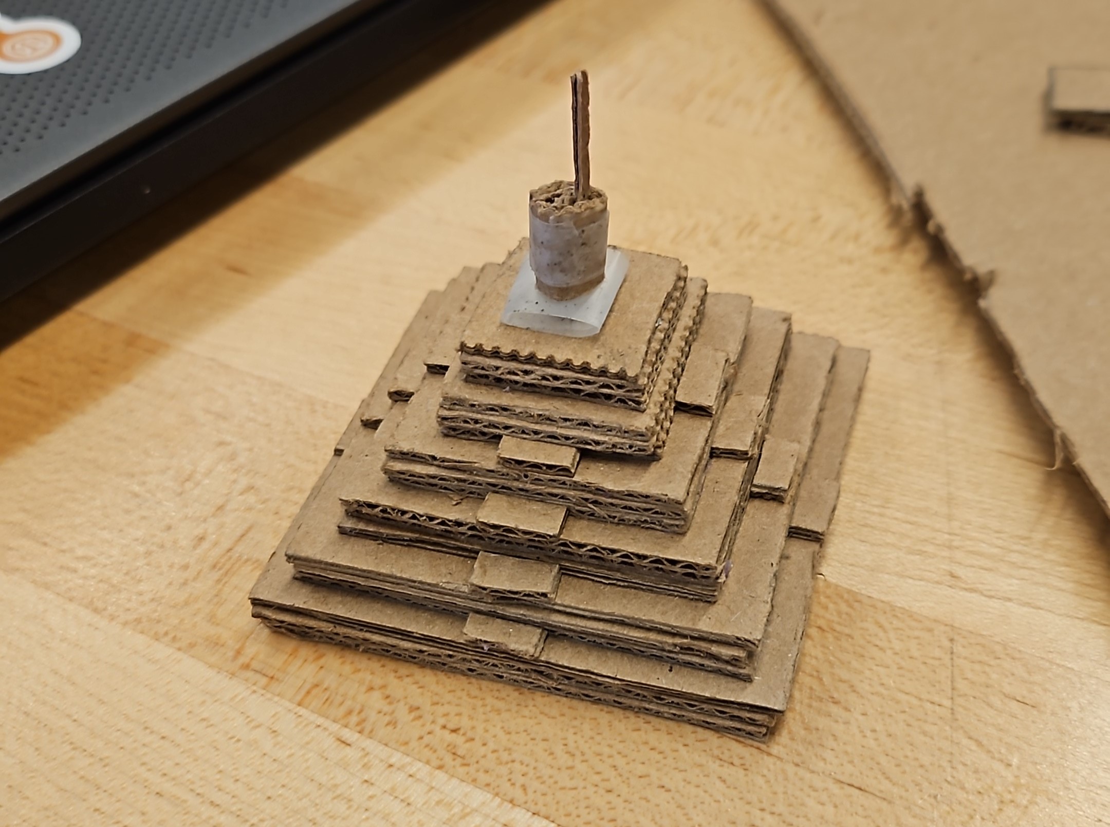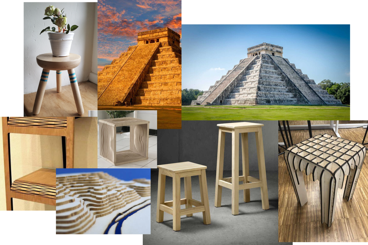I began this project with a general brainstorming of items I could create. I considered the limitations of the material and explored what I could achieve with different sizes of corrugated cardboard by prototyping a Maria doll, a traditional doll commonly made in Mexico. Professor and student feedback was positive, particularly appreciating the personality behind the doll. Therefore, I decided to focus on a culturally significant item and chose Chichen Itza, a Mayan pyramid in southern Mexico. I aimed for the product to serve some sort of function along with being an accent piece, so I combined the pyramid idea with a plant stool.